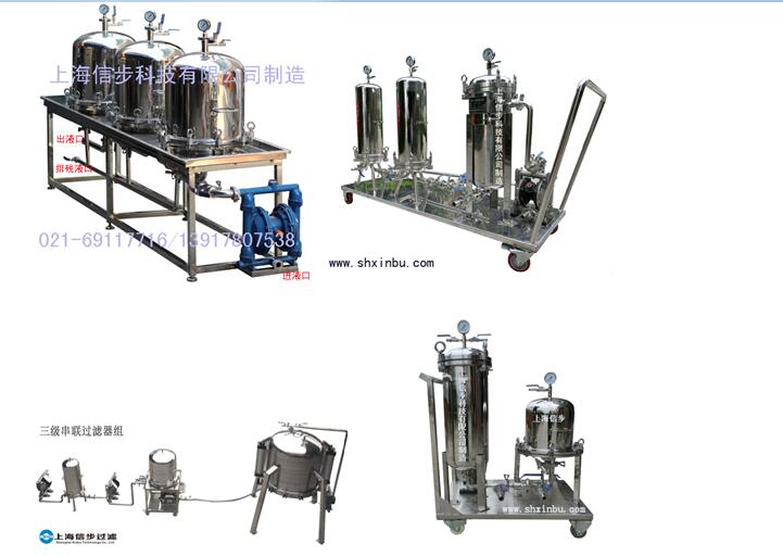 上海信步生产的多级串联过滤器,主要由多台相同或不同规格的不锈钢过滤器串联组成,它可根据不同物料的不同需求而选择不同的过滤器组合,可从一级到三级或更多级过滤的多级过滤系统。过滤器内装上不同精度的过滤介质,可直接达到物料的过滤要求。本机不仅外形美观,操作简单,也大大提高了生产效率。需要时,过滤器也可拆分单独使用。本机可非标定制生产,一切按客户需要而定,保质保量,欢迎来电咨询讨论。